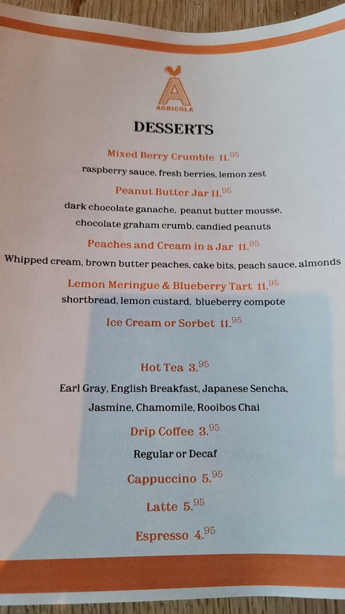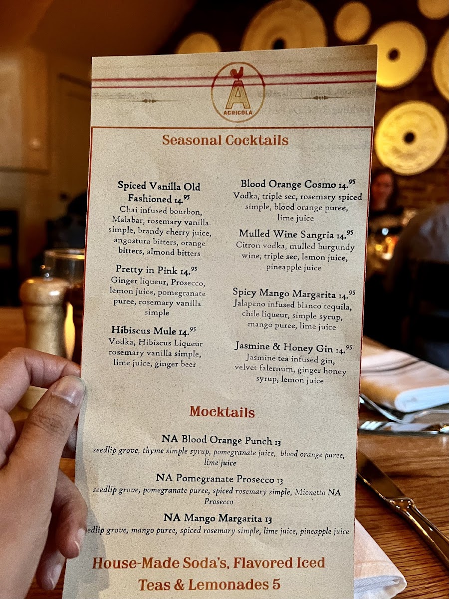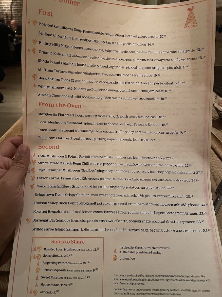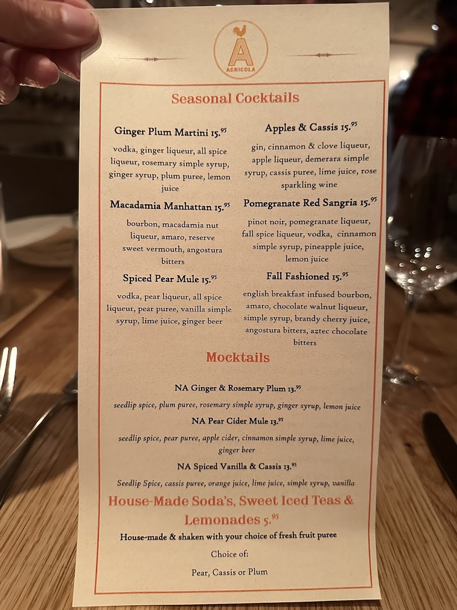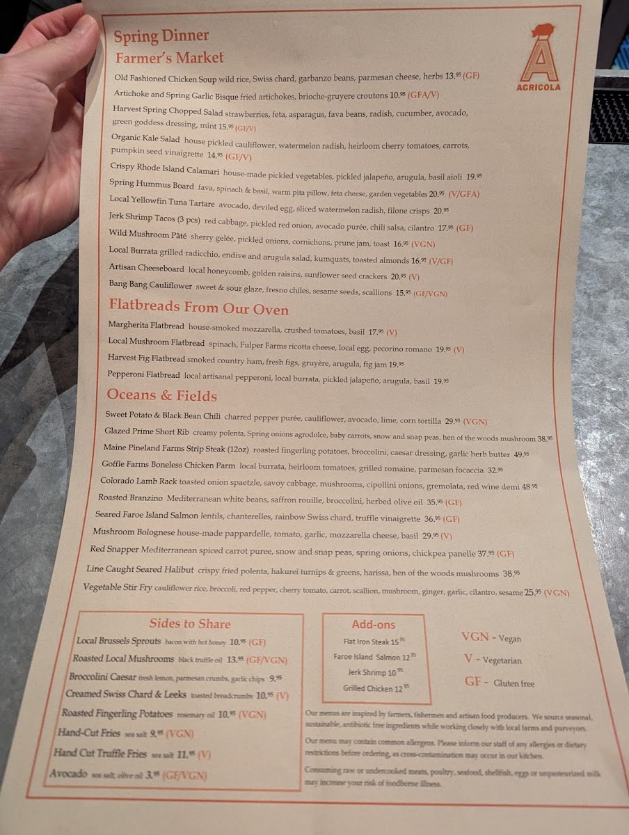 Pricey, but worth it. The food is consistently delicious(we get the short rib and chicken parm).. Always thought the service was good, seems to be even better now. It was a little warm inside, but overall a top notch dining experience. Editing to add: Another out of this world meal at Agricola. Went the day after Christmas and has the most delicious pomegranate glazed short ribs.